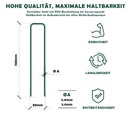 • VIELSEITIGE ANWENDUNG: Ideal zur Befestigung von Unkrautvliesen, Gartennetzen, Schutzplanen und Bodenabdeckungen. Perfekt für den Einsatz im Freien, in Gewächshäusern, Hochbeeten, an Rasenkanten und bei Schutzgeweben für Rasenflächen.