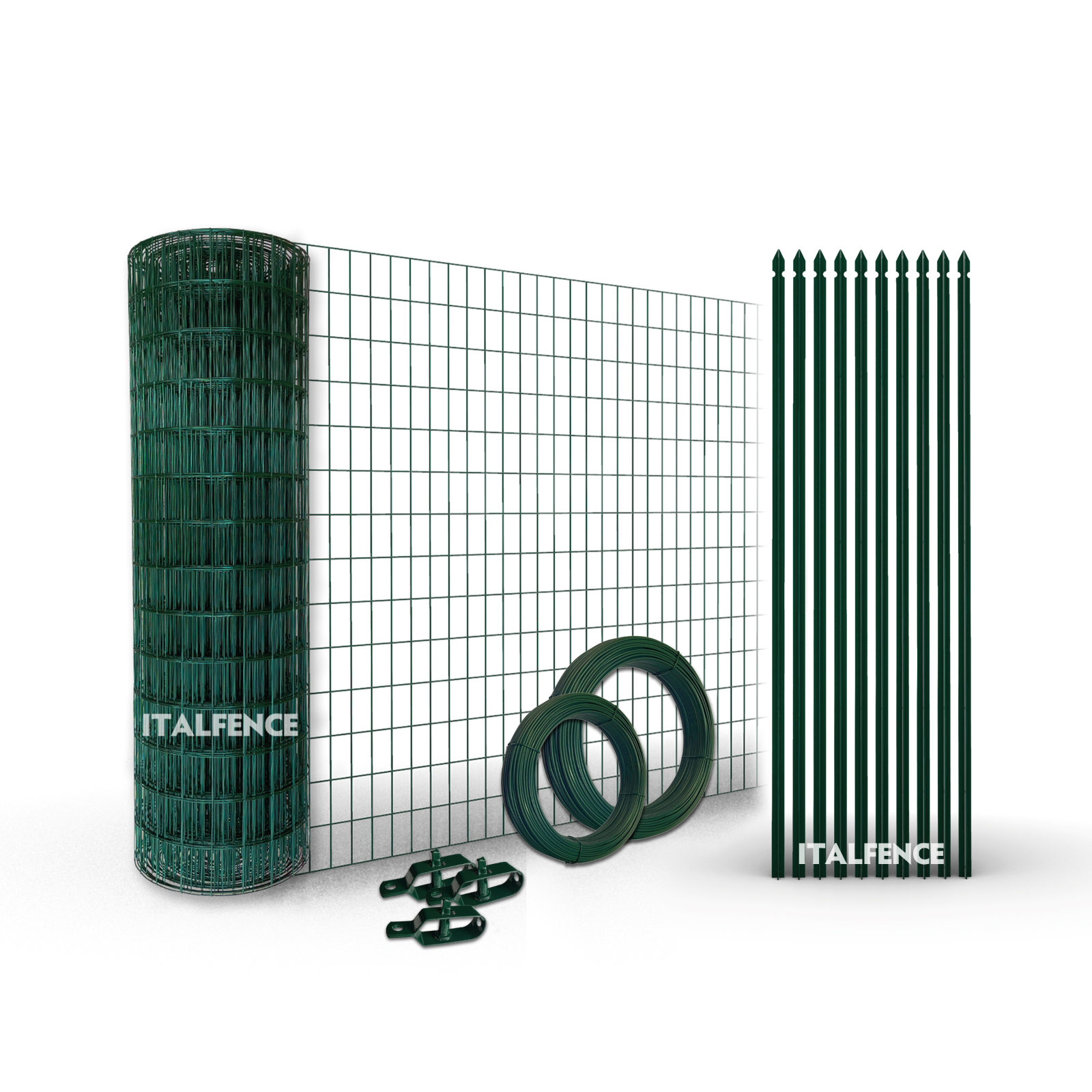 INHALT: Feuerverzinktes und kunststoffbeschichtetes Schweißgitter (75mm x 50mm, Grün RAL6005), T-Profil-Zaunpfosten, Spanndraht (Ø 2,70mm, 100m) und Bindedraht (Ø 1,80mm, 100m) sowie Drahtspanner (3 Stück).