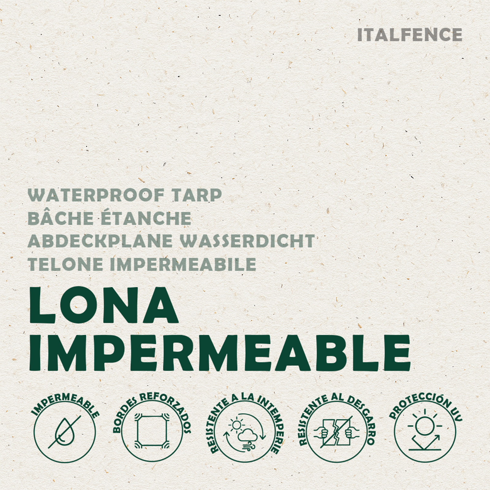 La lona impermeable Italfence de polietileno de alta densidad de 250 g/m² protege eficazmente muebles de jardín, leña, coches, embarcaciones y equipos. El recubrimiento HDPE anti-UV y antimoho hace que el agua resbale, manteniendo todo perfectamente seco.