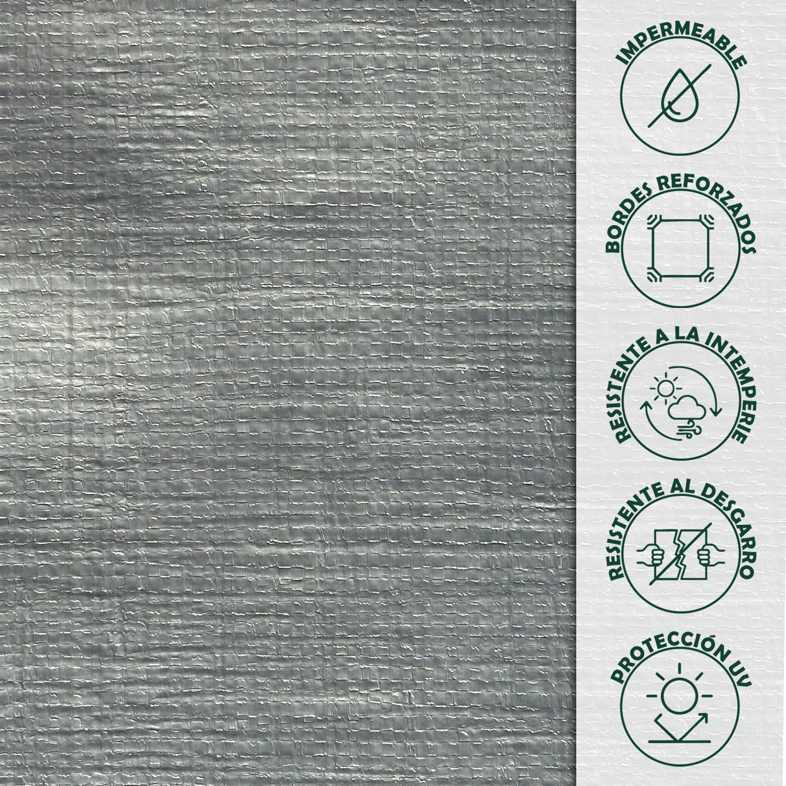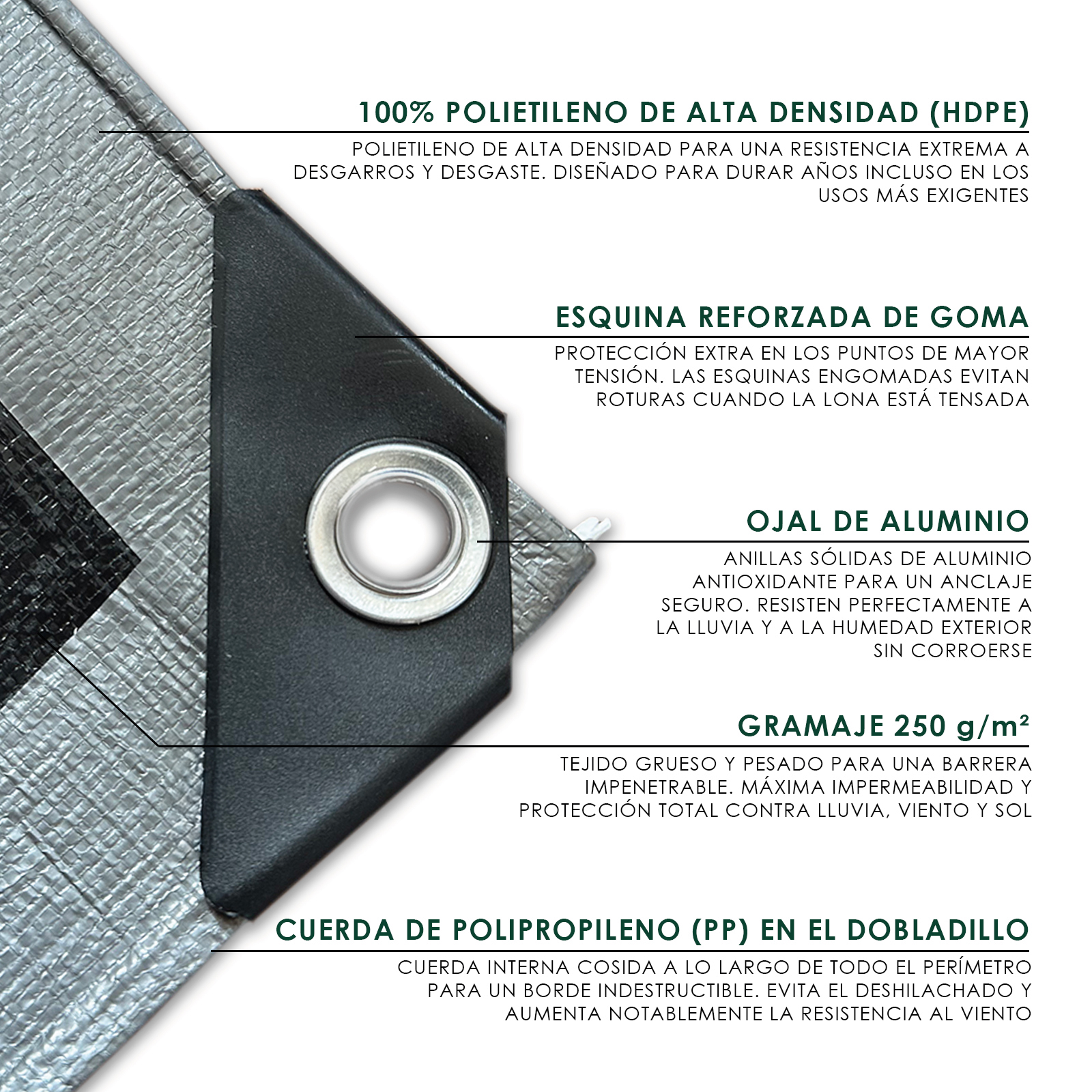 • CARACTERÍSTICAS TÉCNICAS: Material: Polietileno de alta densidad (HDPE); Gramaje: 250 g/m²; Color: Gris; Ojales de aluminio inoxidable cada 100 cm; Bordes reforzados con doble costura perimetral.
