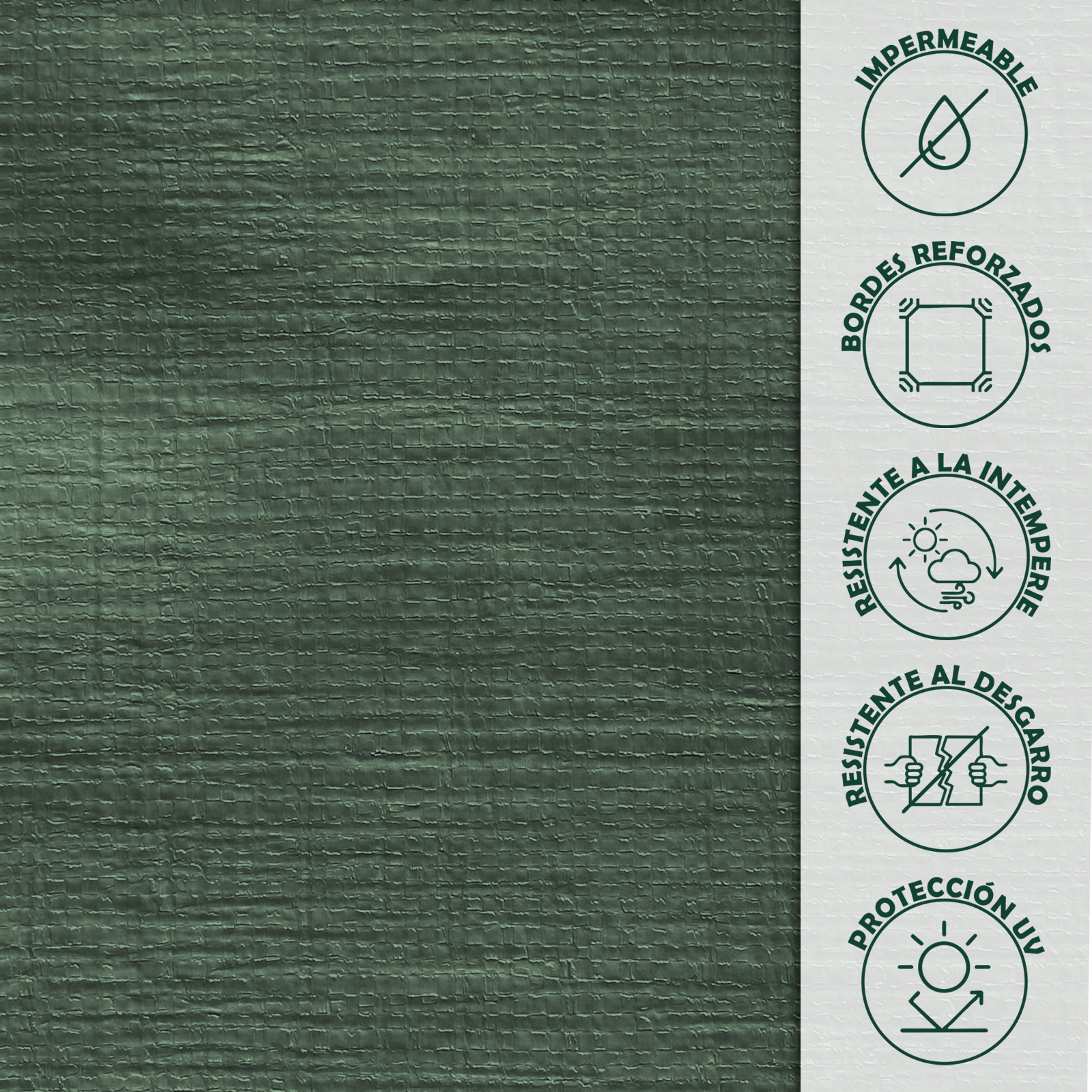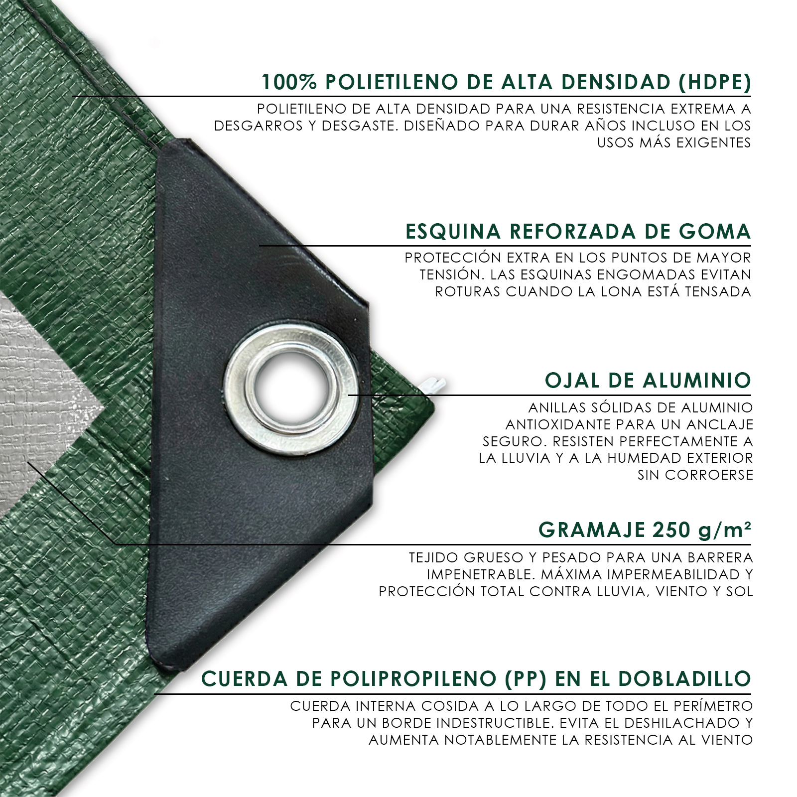- CARACTERÍSTICAS TÉCNICAS: Material: Polietileno de alta densidad (HDPE); Gramaje: 250 g/m²; Color: Verde; Ojales de aluminio inoxidable cada 100 cm; Bordes reforzados con doble costura perimetral.