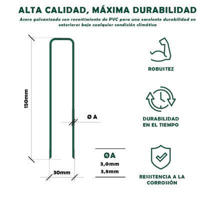 Equipada con clavos de jardín galvanizados 150 x 30 mm con arandelas, se coloca y se fija en pocos minutos. Las líneas guía verdes impresas ayudan a alinear perfectamente las plantas. Ideal para uso doméstico, agrícola y profesional.