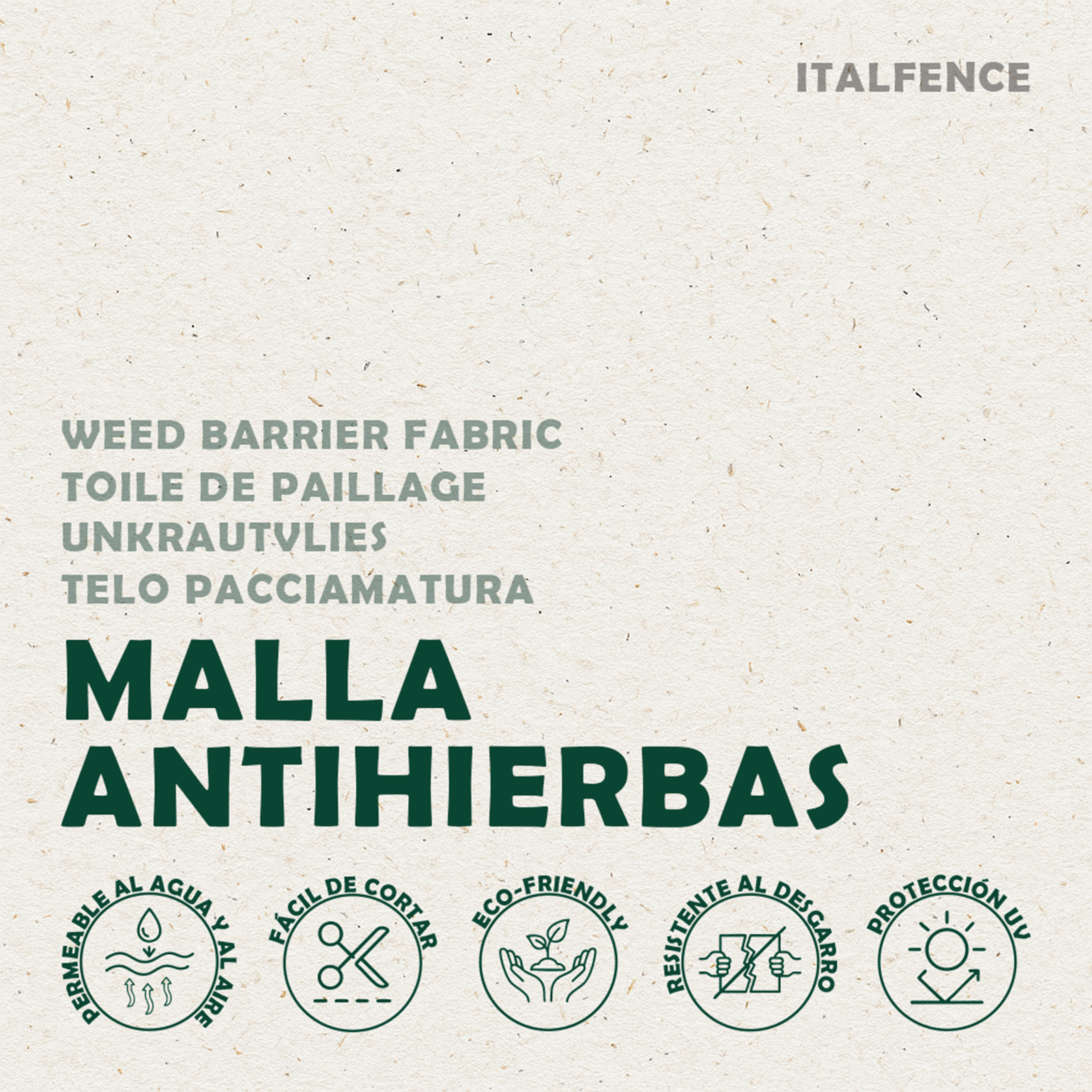 La malla antihierbas Italfence de polipropileno estabilizado contra los rayos UV de 100 g/m² es la solución eficaz para bloquear las malas hierbas en huertos, parterres, invernaderos y jardines, reduciendo drásticamente el uso de herbicidas químicos.