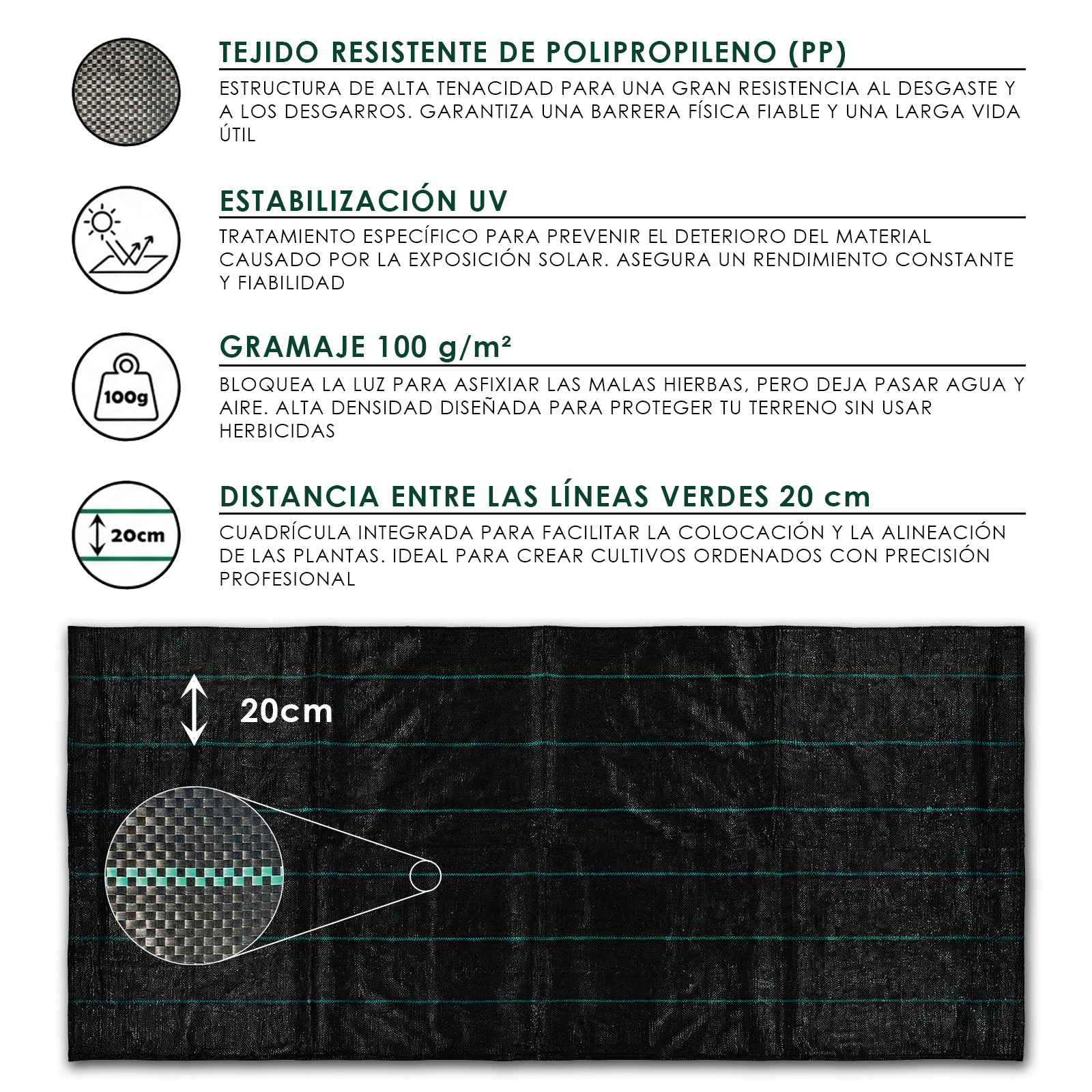 • CARACTERÍSTICAS TÉCNICAS: Material: Polipropileno estabilizado contra los rayos UV; Gramaje: 100 g/m²; Color: Negro; Clavos de jardín galvanizados con arandelas de dimensión 150 x 30 mm; Líneas guía verdes impresas para la alineación de las plantas.