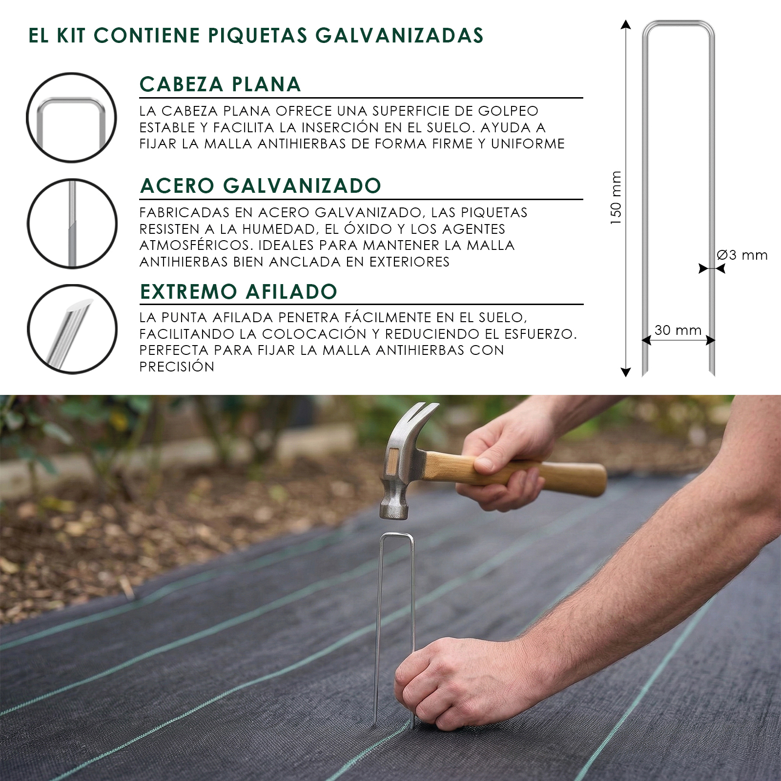Malla antihierbas 100 g/m² con clavos de jardín y arandelas