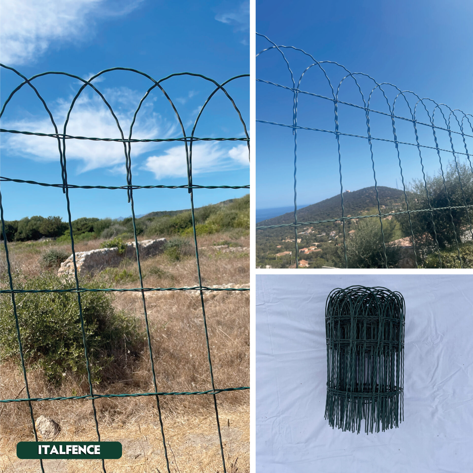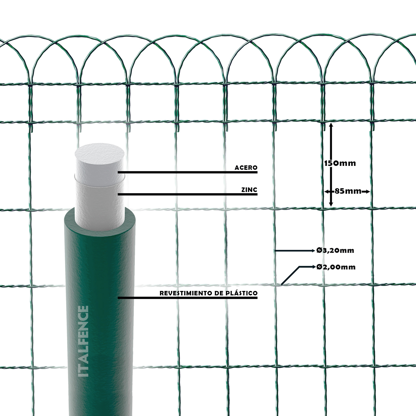 Esta malla de jardín está fabricada con alambre de hierro galvanizado y plastificado. El robusto alambre vertical tiene un diámetro de 3,20mm, mientras que el doble alambre horizontal trenzado presenta un diámetro de 2,00mm.