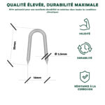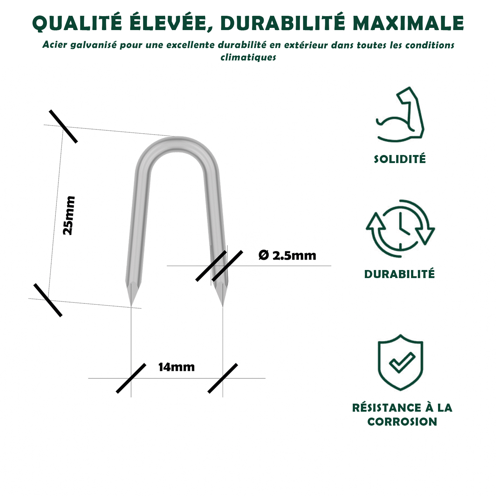 Les crampillons en acier galvanisé Ø2,2 x 25 mm sont idéals pour fixer les fils de tension et les grillages métalliques sur des poteaux ou des structures en bois, parfaits pour un usage professionnel ou en bricolage.