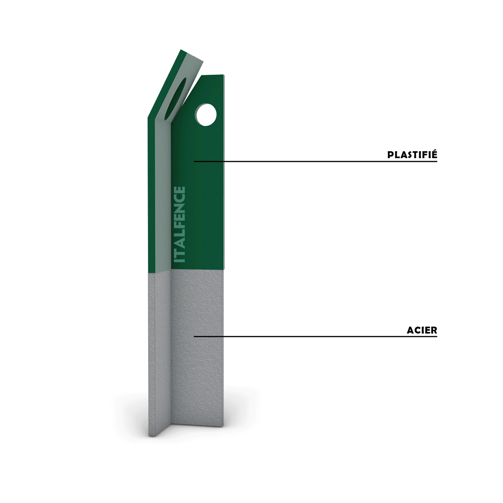 La jambe de force plastifié vert, également appelée poteau incliné en fer avec une section en “L”, est essentielle pour assurer la stabilité de la clôture en apportant un renforcement indispensable.