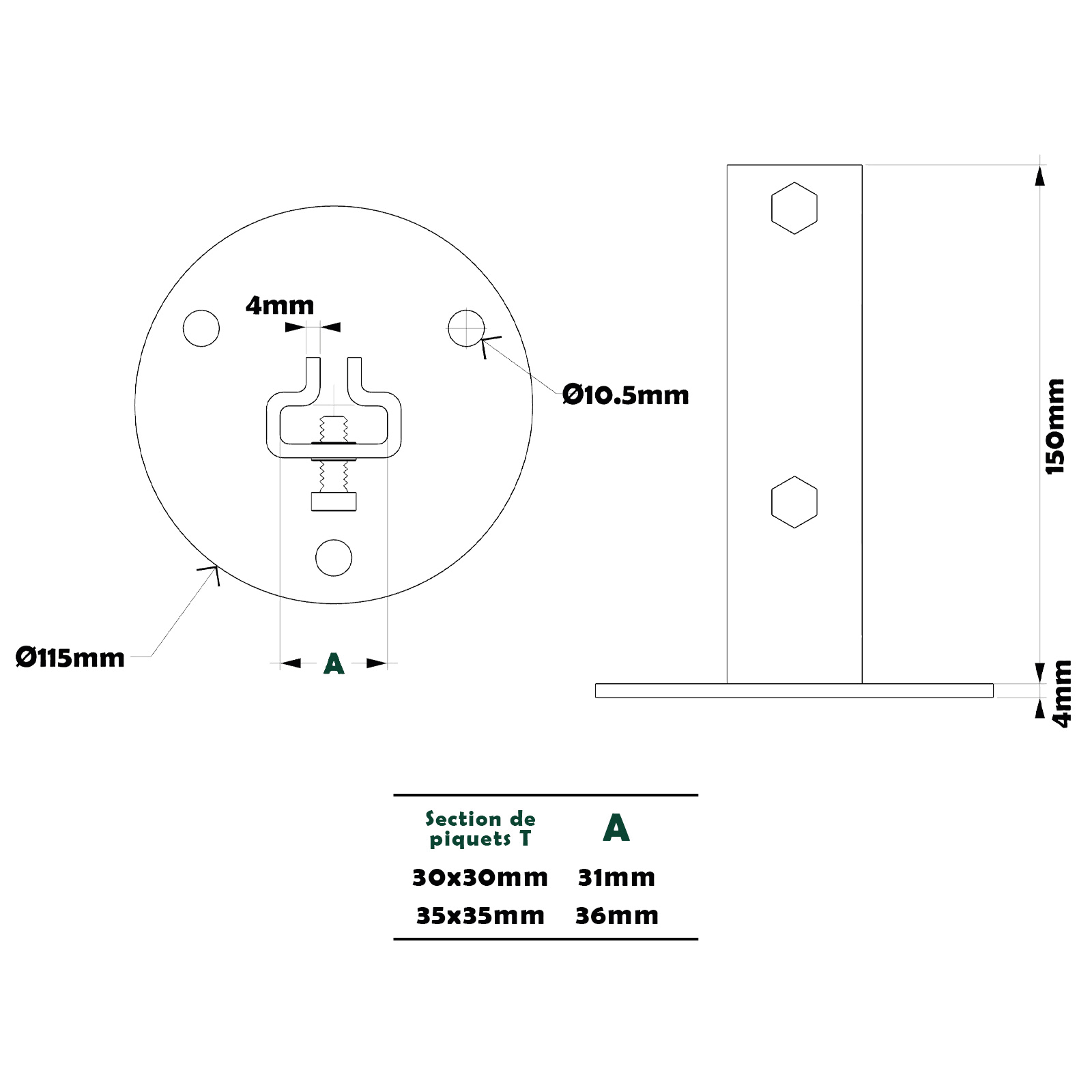 Platine de fixation pour piquet T plastifié vert