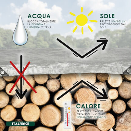 Il rivestimento HDPE impermeabile, anti-UV e antimuffa, unito alla doppia cucitura perimetrale rinforzata e agli occhielli in alluminio antiruggine ogni 100 cm, assicura tenuta stagna e grande resistenza a strappi, vento e temporali.
