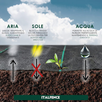 Grazie alla sua elevata permeabilità all’acqua e all’aria, lascia passare pioggia e nutrienti fino alle radici, favorendo la traspirazione del suolo e mantenendo il terreno sano. Il polipropilene ad alta densità resiste a strappi, raggi UV e intemperie, garantendo una lunga durata.
