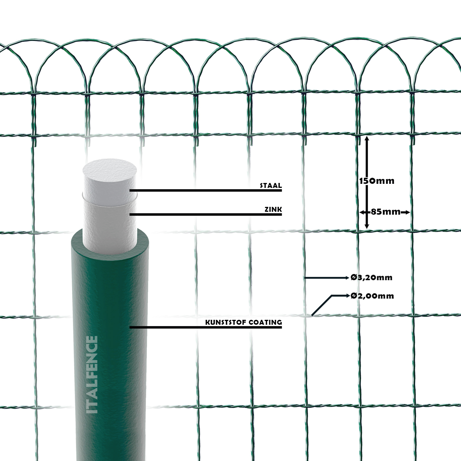 - TECHNISCHE KENMERKEN: Materiaal: Verzinkte en geplastificeerde ijzerdraad; Maaswijdte: 150 x 90mm; PVC Kleur: Groen (RAL6005); Draaddiameter: 3,20 mm / 2,00mm.