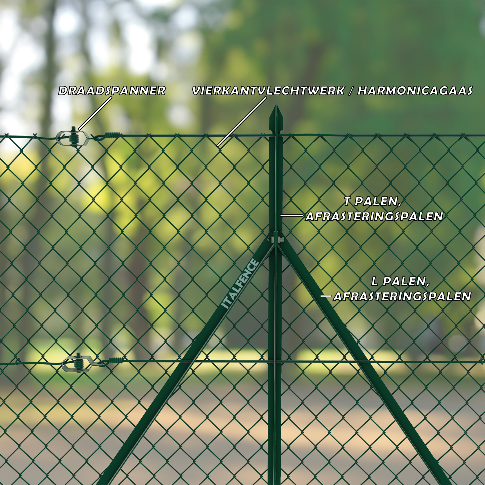 - HOOGTEBEREKENING: De hoogte van de schoor hangt af van waar het net wordt geplaatst, op aarde of op beton. Op aarde: gelijk aan het gemiddelde van de hoogte van de omheining en de hoogte van de paal. Op beton: gelijk aan de hoogte van de omheining.