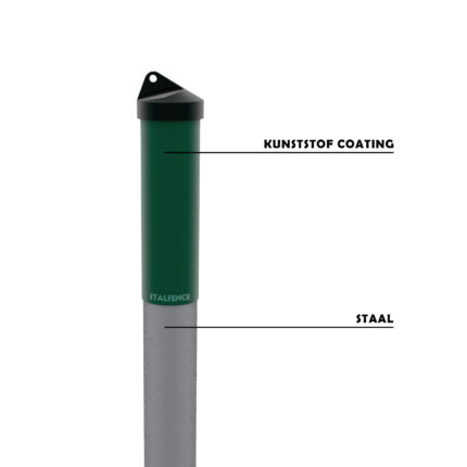 De buispaal is een ijzeren paal met een ronde doorsnede, ontworpen met groene PVC-draadgaten voor het doorvoeren van spandraden en een zwarte topdop.