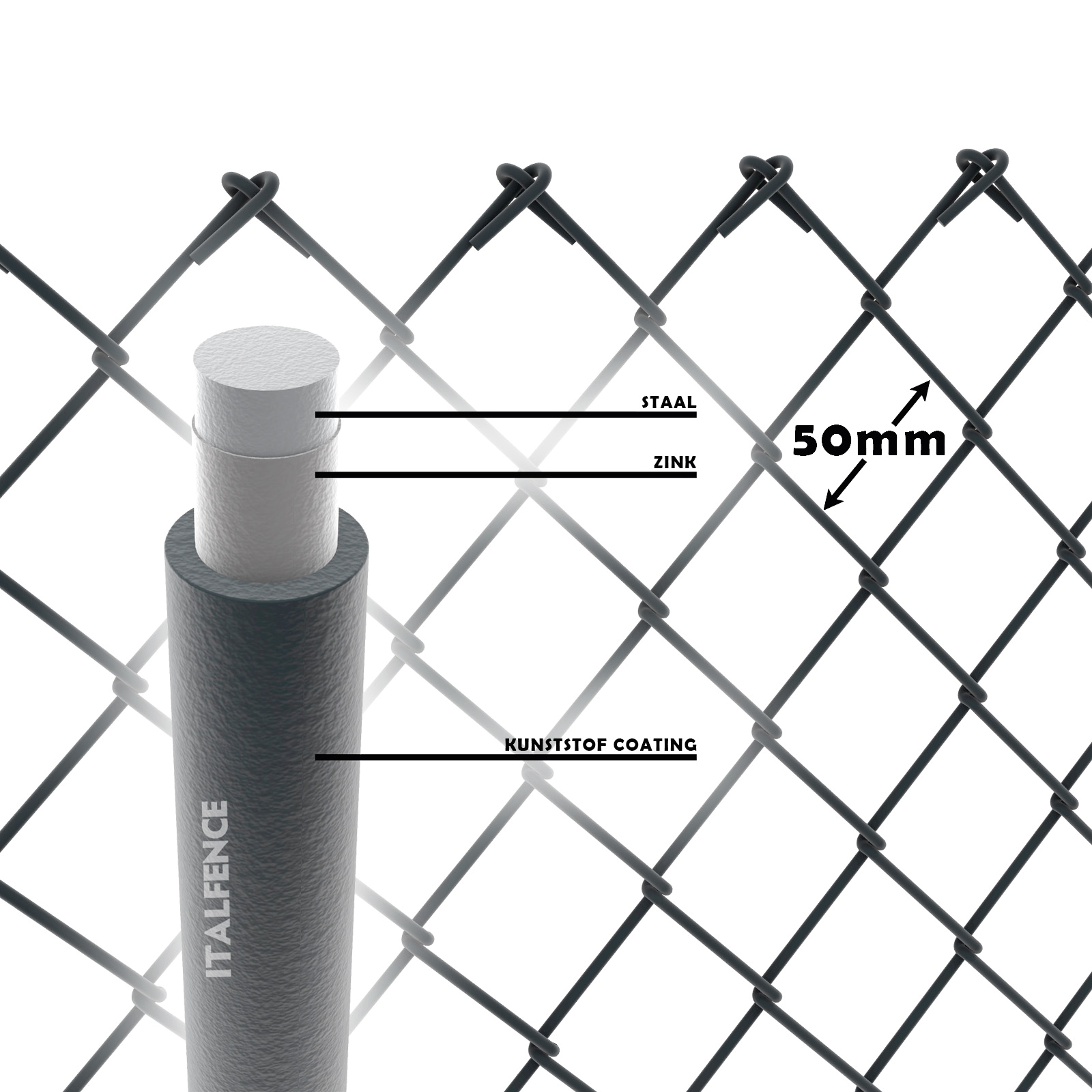 • TECHNISCHE KENMERKEN: Materiaal: Verzinkt en geplastificeerd ijzerdraad; Maaswijdte: 50 x 50 mm; PVC-kleur: Antracietgrijs (RAL7016); Norm: UNI-EN 10218-2.