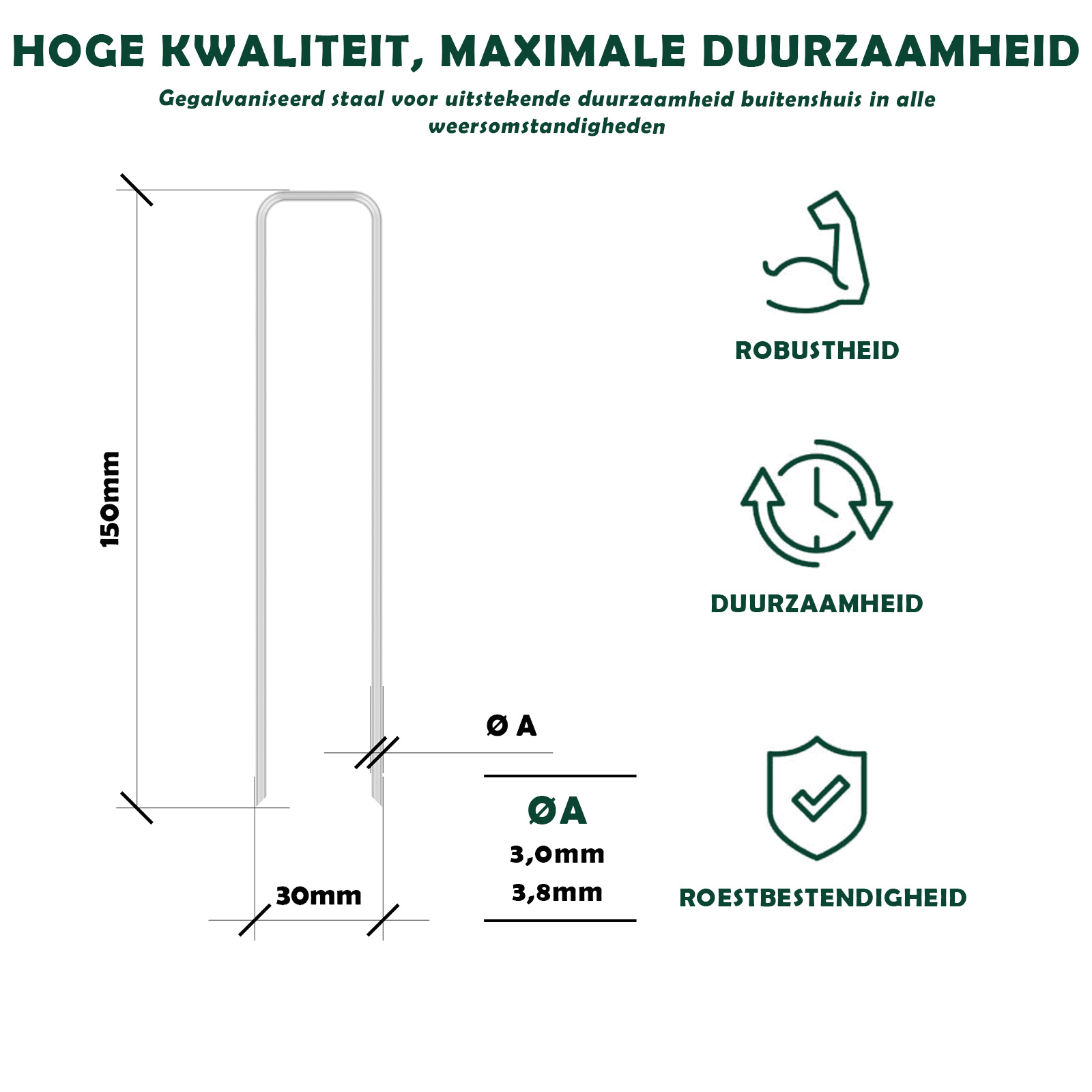 - TECHNISCHE KENMERKEN: Materiaal: Verzinkt ijzerdraad; Ø Draad: Ø3,00mm/3,80mm; Afmeting: 150x30mm; U-vorm met platte kop en scherpe uiteinden.