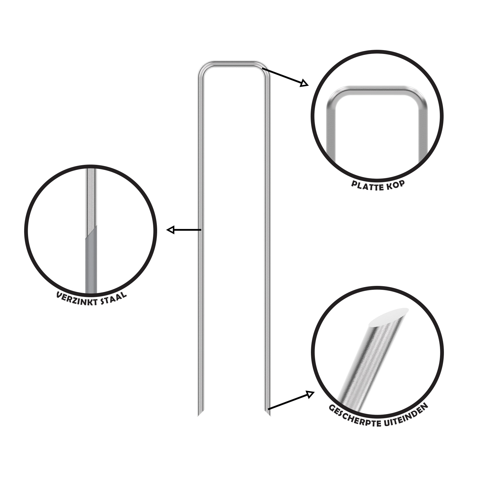 Het U-vormige ontwerp met platte kop en scherpe uiteinden vergemakkelijkt het moeiteloos inbrengen in de grond, zelfs op harde of stenige oppervlakken, zonder dat er extra gereedschap nodig is.