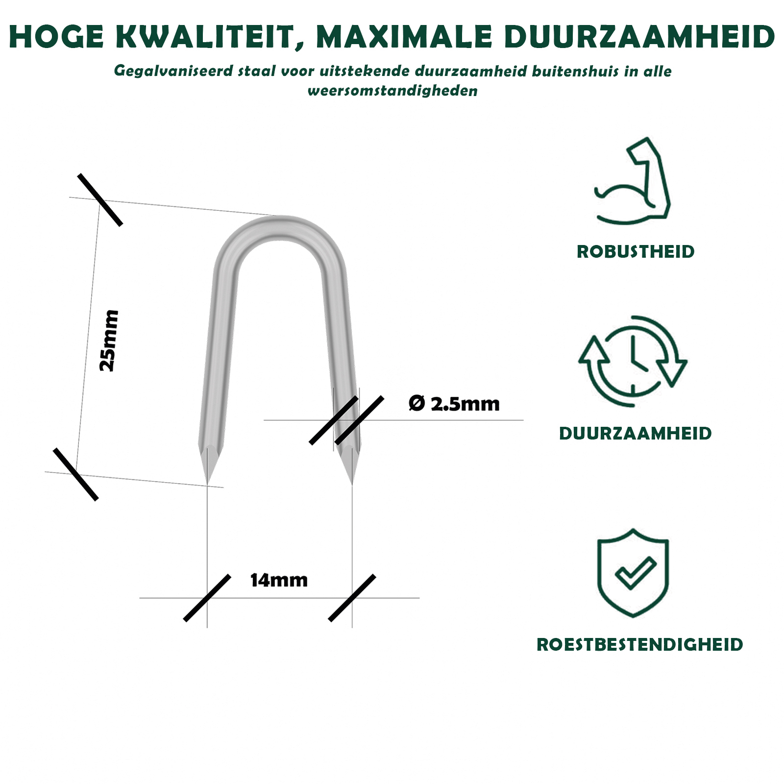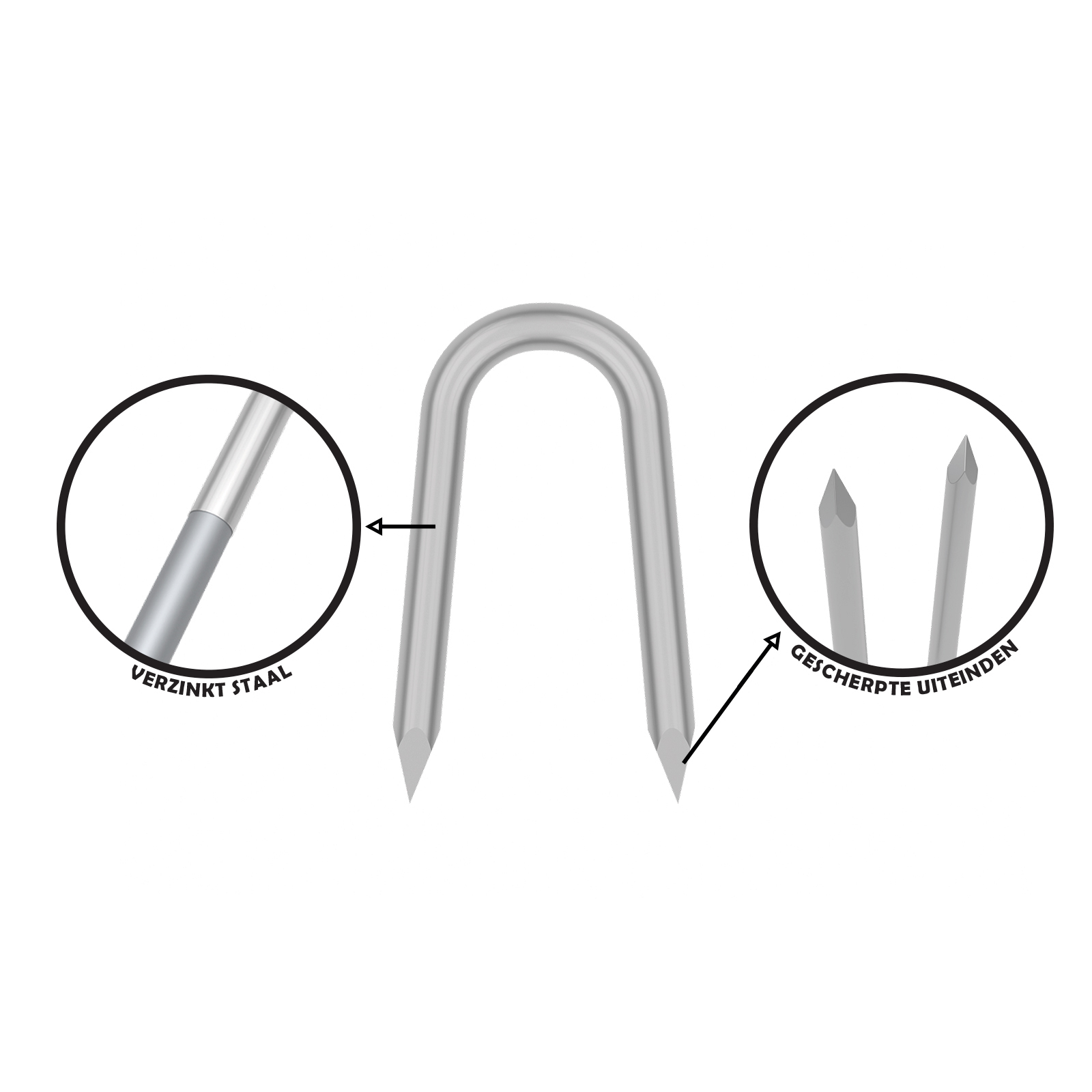 De verzinkte stalen krampen Ø2,2 x 25 mm zijn ideaal om trekdraden en metalen netten op houten palen of structuren vast te zetten, perfect voor professioneel of doe-het-zelf gebruik.