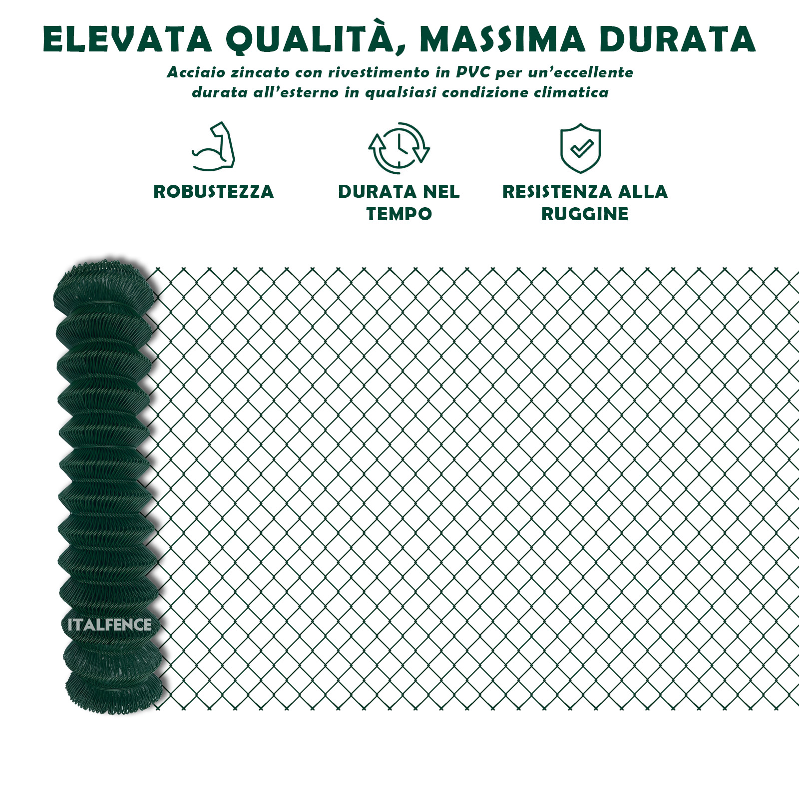 • CARATTERISTICHE TECNICHE: Materiale: Filo di ferro zincato e plastificato; Dimensione della maglia: 50 x 50 mm; Colore PVC: Verde (RAL6005); Norma: UNI-EN 10218-2.